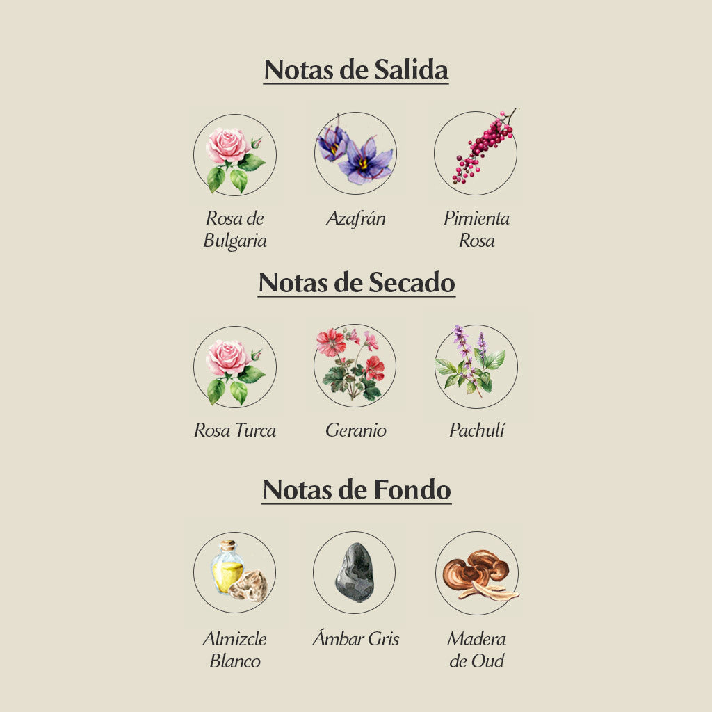 ✔️ Aroma potente de rosa y jazmín, con una base amaderada y limpia.