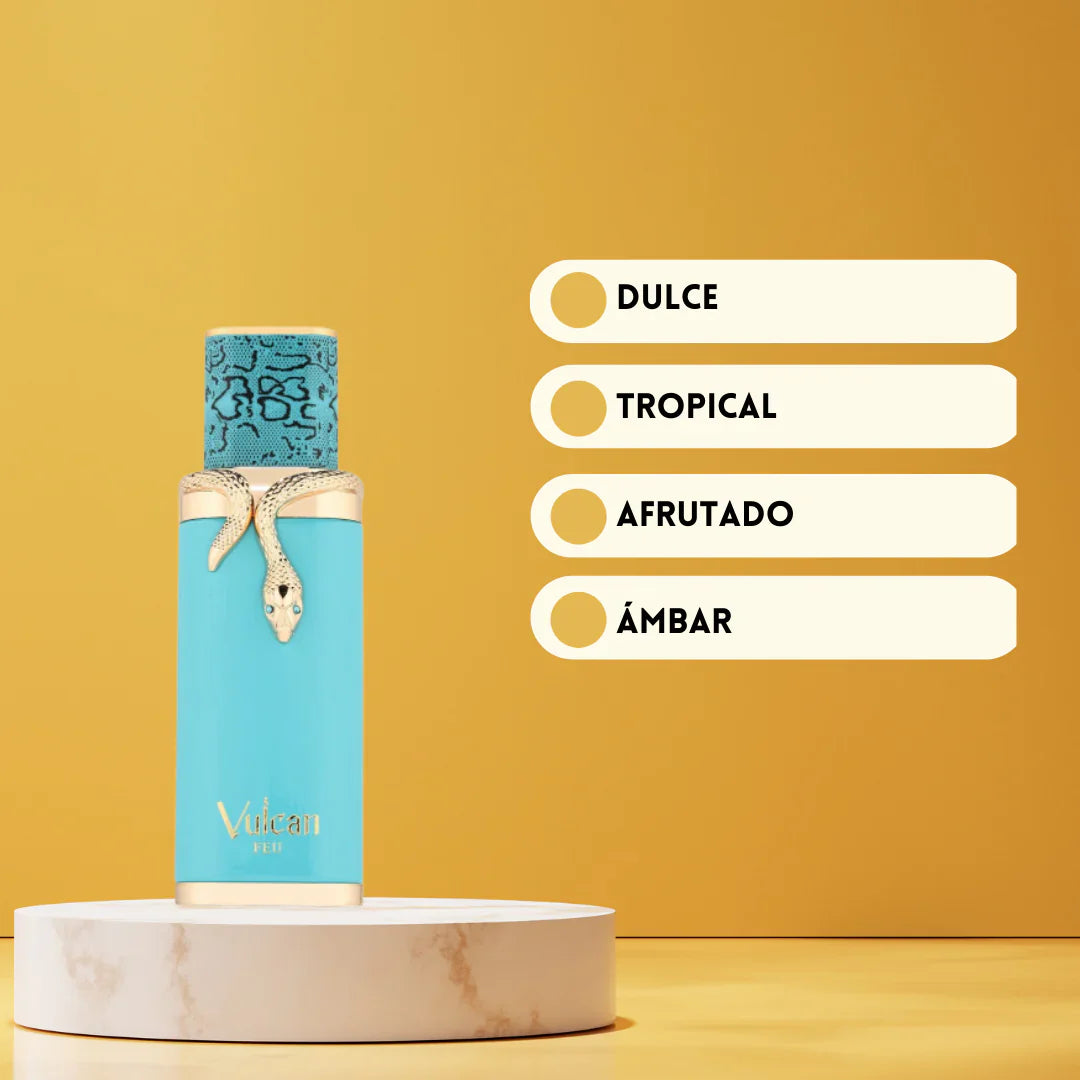 Una fragancia masculina Ámbar Especiada, cálida y audaz. Vulcan Feu es un perfume que evoca la fuerza y el poder del fuego con una composición rica y seductora. Se abre con una combinación potente de especias, pimienta rosa y cítricos, creando una primera impresión enérgica y chispeante. El corazón de la fragancia se despliega con la sensualidad de la rosa y la dulzura del cacao y el caramelo, que le da un toque gourmand inesperado. El secado es un abrazo profundo y duradero de ámbar, benjuí y un toque de ládano, que le confiere una base resinosa, dulce y con una calidez irresistible. Es un perfume para el hombre que busca dejar una estela memorable y audaz.