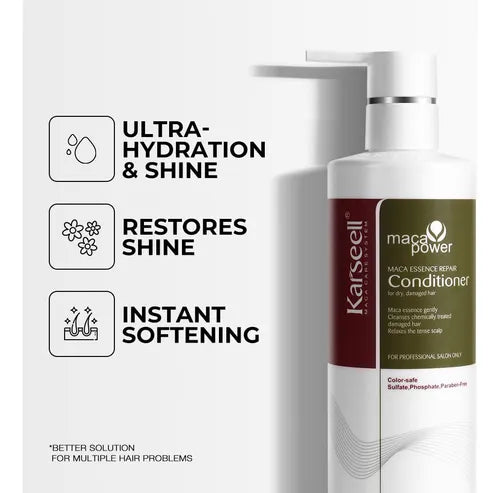 El complemento perfecto para tu rutina de reparación capilar. El acondicionador Karseell Maca Power con Colágeno está diseñado para nutrir, suavizar y desenredar el cabello seco y dañado, potenciando y manteniendo los efectos de la famosa mascarilla de la marca. Su fórmula rica y cremosa trabaja en cada hebra para devolverle la vida, el brillo y la sedosidad.