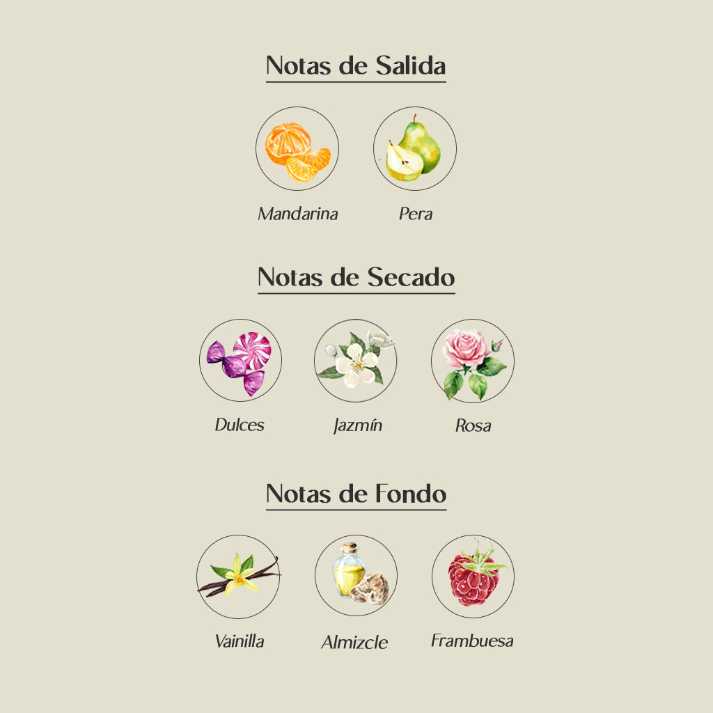 🥥 Coco – 🍬 Dulce – 💧 Almizclado – 🌸 Floral – 🍦 Vainilla