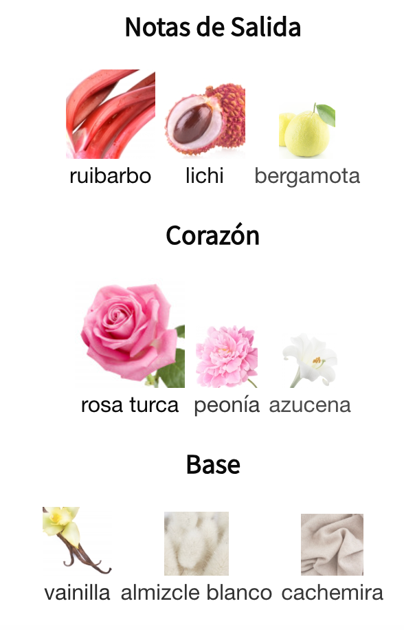 🌹 Rosa – 🍒 Afrutado/Lichi – 🌿 Verde/Rhubarb – 🧼 Almizclado – 🌸 Floral