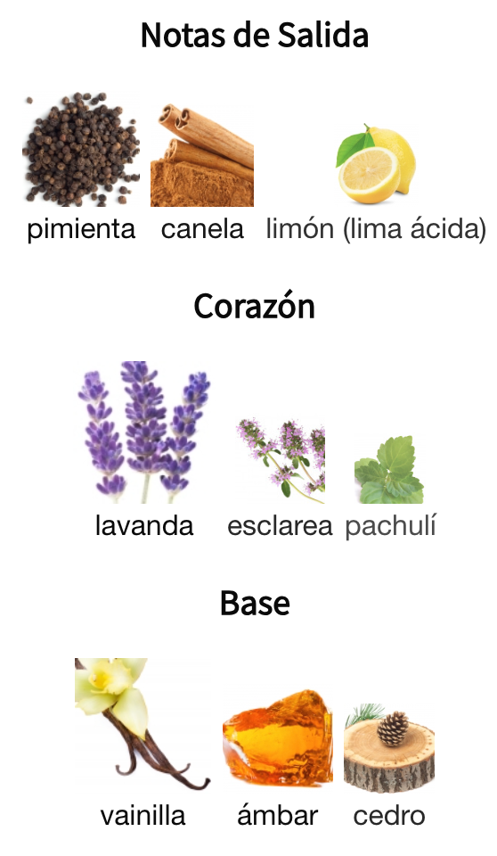 Fondo: Vainilla, Ámbar, Madera de Cedro.